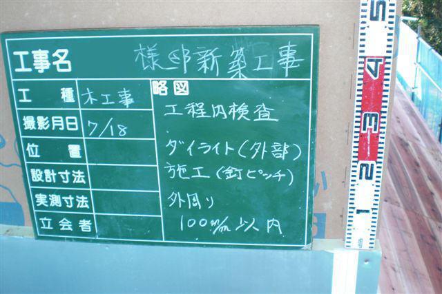 外部に張り付ける、ダイライトの釘のピッチを確認しています。
