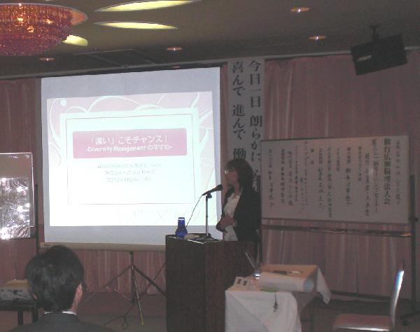 今回は「ダイバーシティ&インクルージョン、違いこそチャンス!」というテーマでプレデンシャル生命保険(株)の深沢ひとみ様のセミナーでした。「ダイバーシティ」って何?と思ったら、「多様性」のことだそうです。震災後、ACのCM「こだまでしょうか? いいえ誰でも」の童謡作家、金子みすずさんの作品「私と小鳥とすずと」を交えながら、女性初の執行役員という方だけあって、キレのある言葉と的確な説明をしていただきました。同じ考えの人だけでは「危険」、違う考え・意見から「変化」[改善」が生まれてくるそうです。有意義な時間をありがとうございました。セント 小岩昇平