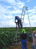 ぶらさがり健康器みたいですが、体重をかけて鉄パイプを地中に差し込んでいます。農場長、たぶん今夜はぐっすり眠れることでしょう。