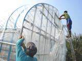 ハウスの組み立てが終了しましたので、いよいよビニール部隊の登場。