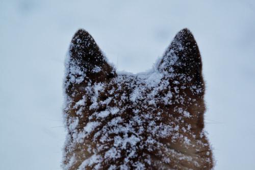 犬っ子達と散歩に出た途端に、けっこう猛烈な雪が降って来た。