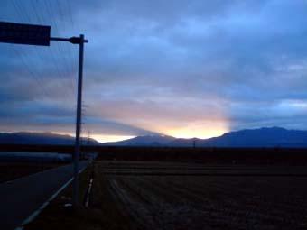 蔵王雁戸山と竜山の間から朝日がパーっと射した。(ちなみに今日の日の出は06:47でした。)