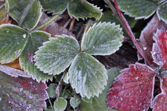 <冷え>にワンクッションを与えてくれる雪も消えてしまい、ちょっと痛々しく霜がついてしまった、道端のイチゴの葉っぱ。(日の出時刻の06:54頃)