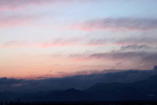 「春は曙」と言うにはまだまだ寒いけど、ずいぶん穏やかな光になって来て、明らかに厳冬期の雪雲とは違ってきた感じがする。(日の出時刻 06:28頃の蔵王山系竜山北側稜線)