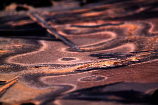 今朝はほぼ快晴。日の出時刻(06:29)を5分ほど過ぎた頃、散歩コースの農道に張った只の氷の膜に空の色が映り込んで、ちょっと<妖しい宝石>の様な表情を見せた。
