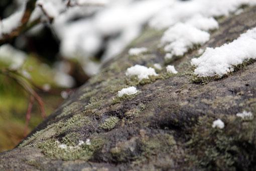 家に転がっている、通称:蔵王石などと呼ばれるコケムシタ石にも、淡く雪が積もっていた。