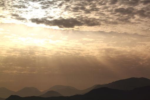 奥羽山脈上空の雲間から、良い感じの光の筋が降りて来ていた。