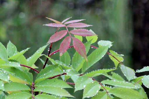 ▼ナナカマドの赤い若葉にも、穏やかな雨が。