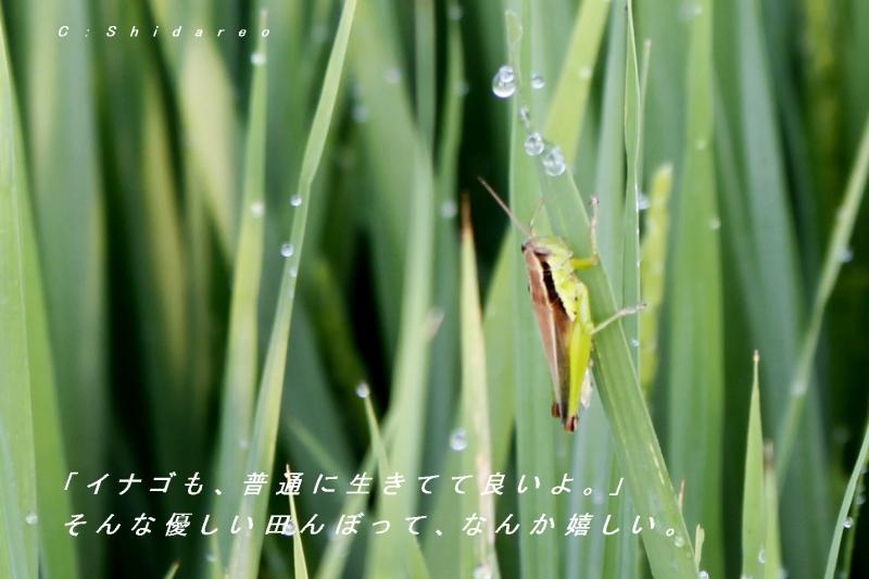朝露でまだ飛べないで固まっている「イナゴ」を見つけた。