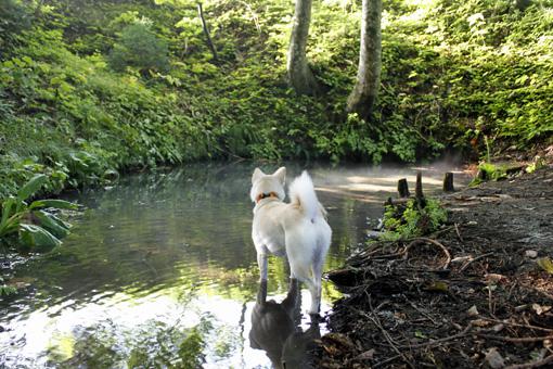 ▼週末:自然湧水にたたずむ犬っ子モッチ(Motchi:妹・2歳)。