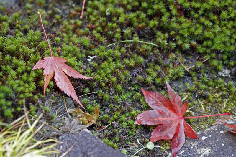 帰宅して、庭先を見ると、杉苔の上に濡れたモミジが。
