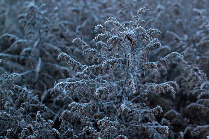 ▼粉糖みたいだ。冬枯れのヨモギに白い朝霜が。