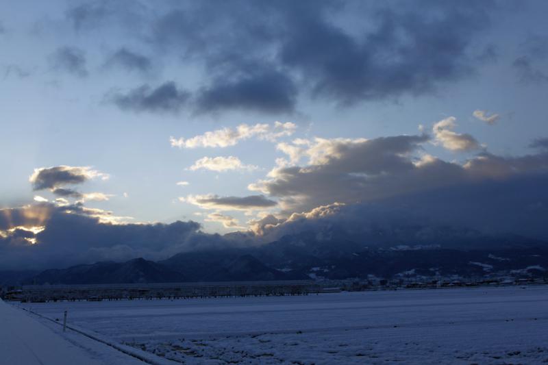 奥羽山脈はじめ周囲の山々には雪雲がかかっている。
