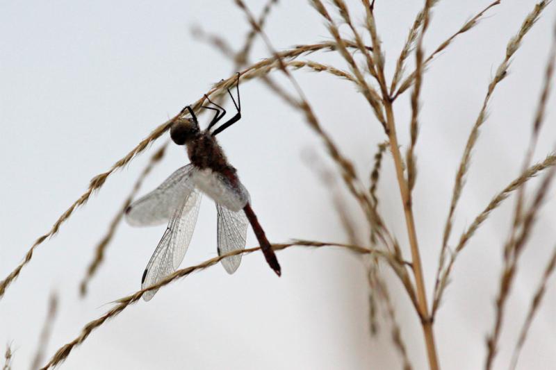 霜の降りた枯れススキに、霜の降りたトンボが停まっていた。