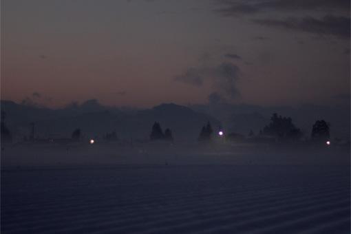 西に残る月も、霧(というより氷の粒だろうけど)で滲んでる。