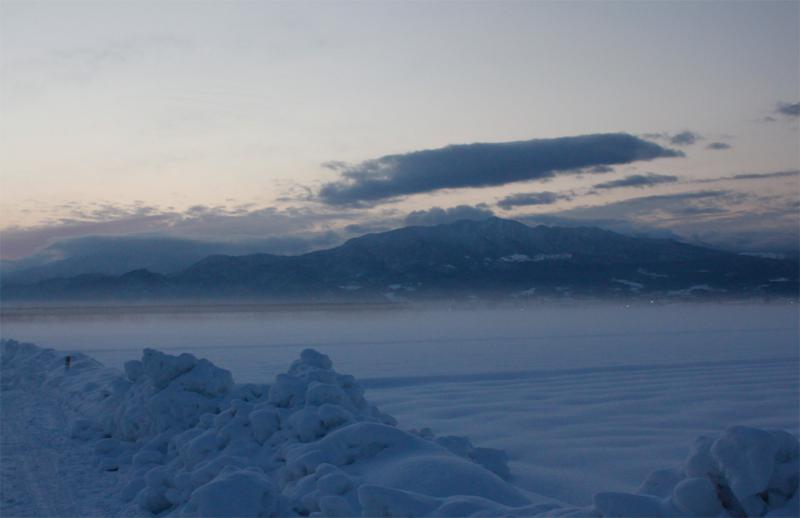 ほぼ無風。雪原が冷えた空気に覆われて、凍った霧が漂っている。