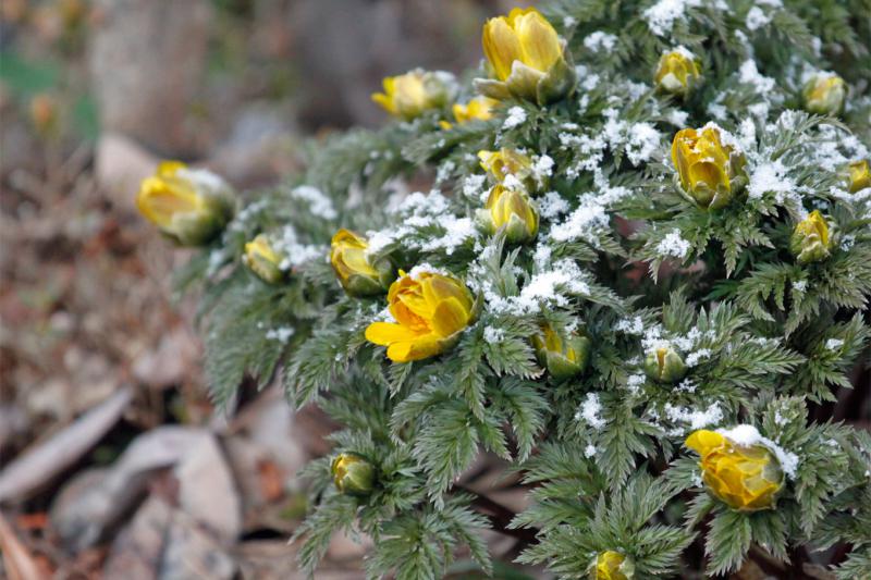 ようやく咲き始めた福寿草も、やや遠慮がちでした。