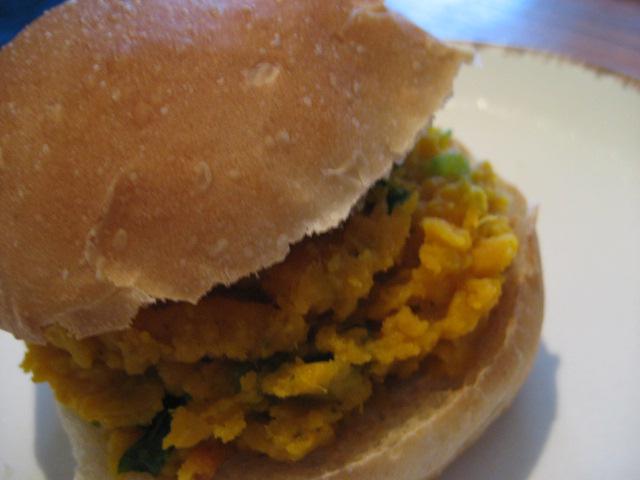 てづくりのかぼちゃサラダをはさんで、バーガー。