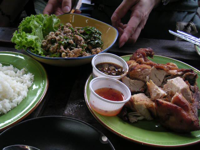 焼いた鶏が食べたいと食堂を選び、他に何を頼もうか考えながら周りを眺めていたら、隣のテーブルの現地女性客が「これとこれがおすすめよ」てな感じに教えてくれたので、その通りに。