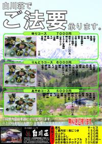 あやめコース 5000円 りんどうコース6000円 ゆりコース 7000円 とございます。こちらは御食事代・お部屋代が込みとなっています。 もちろん無料送迎付です。 是非、ご法要は白川荘で!!! |