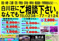 お泊・部落の集会・契約・花見・歓送迎会・芋煮会・子供会などなどの幹事さんへ お悩みを白川荘が解決致します。 どんなことでもOKです。なんでもご相談下さい。 お電話番号0238−77−2124です お電話お待ち致しております。 |