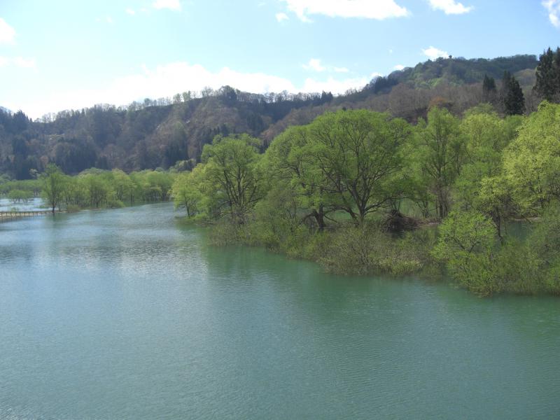自慢の新緑の景色。湖の水が減らず、まだまだ続きそうです。