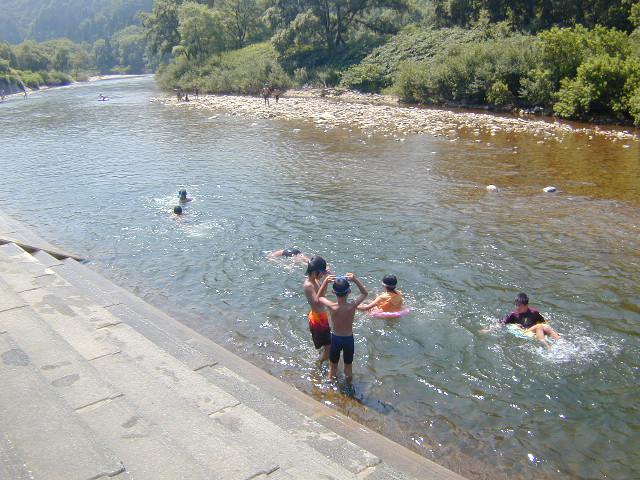 白川荘隣の、湖畔公園の白川湖での川遊び風景。