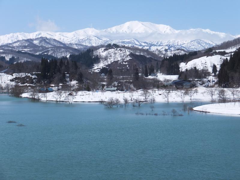 満水の白川湖 エメラルドグリーンの湖面が眩しーいっ。柳の新芽が間もなく吹き出し、カメラマンがわんさか押し寄せますよ。