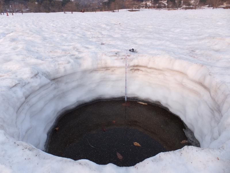 連日、朝から「パークゴルフ場のオープンはいつだ?」のお問い合わせが続いています。コース上の雪解けが進みました。今日の夕方現在で47cmでした。あと3〜4日いい天気が続けば、待ちに待った地面が半年ぶりで顔を出しそうです。頑張って整備を急げばGWオープンも間に合いそうです。とにかく雪よ、早く溶けてくれー。