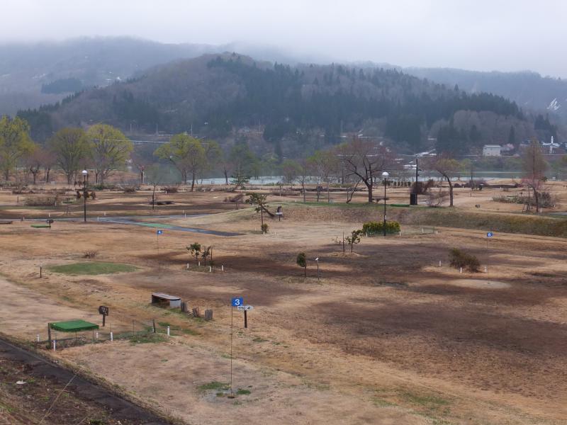 明日5月1日から3日間は、パークゴルフ場の無料開放となります。白川湖の満水、柳の芽吹き、桜に残雪、真っ白な雪を頂く飯豊山、抜けるような青空の下で、思いっきりスイングしよう。レッゴー・パーク・イン「白川湖」