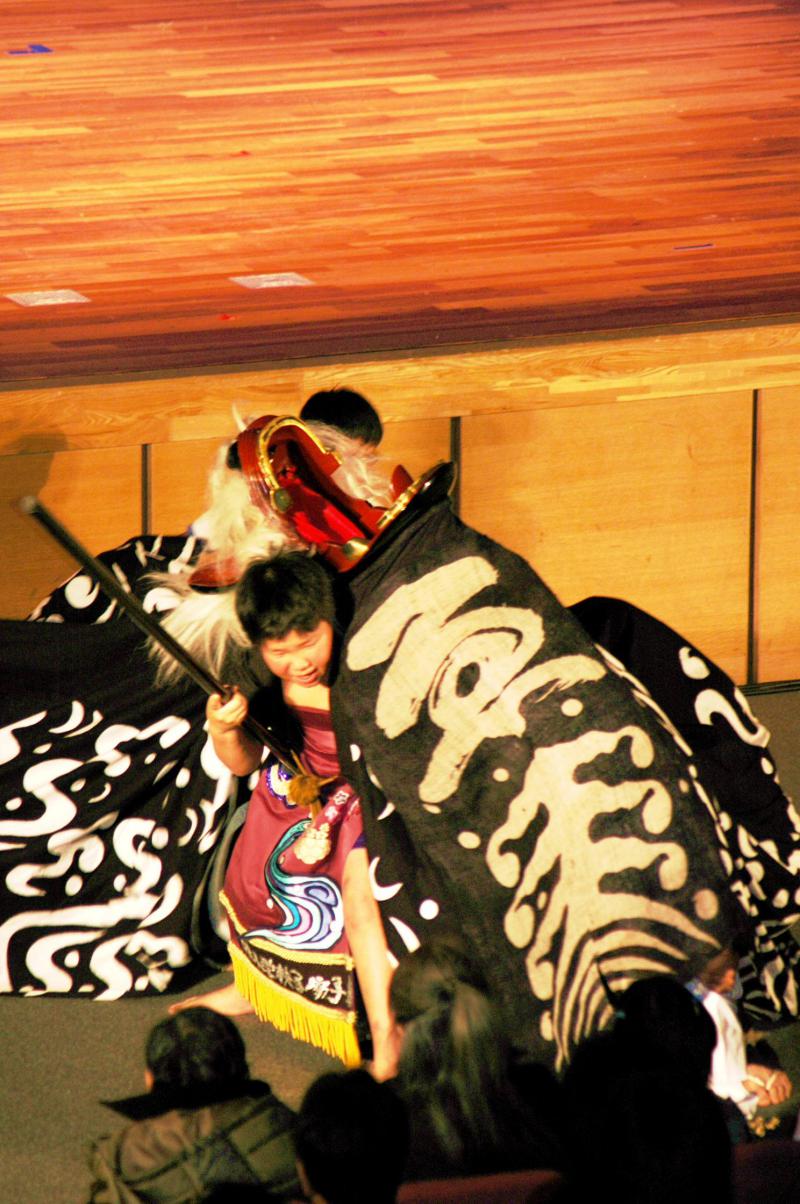 二回の警護かかりも見事に決まりました。最初は四年生の引地君でした。彼は三年の時に学校で小出の方に獅子舞を習ったのをきっかけで獅子舞クラブに入りました。でももうすでにちゃんと「見返し」という基本動作ができていてびっくりしました。いやぁー小出の方がうまくご指導されたのでしょうね!という訳で彼はめきめき獅子振りの腕をあげてきたのです。二人目は六年生の立石君。彼は甘いマスクに背も高く最初は警護をさせたかったのですが、恥ずかしがりの彼は辞退したのでした。あと二人の六年生は太鼓がずば抜けて上手かったので獅子振りが不足しました。元気のいい応援隊を募集して手伝ってもらいました。女の子の笛も数名お願いしてなんとかなったようです。応援隊の中から体格のいい男子を警護に任命したのですが突然の失踪!突然代役に松田君が指名されましたが実にいい警護を演じてくれました。思い出せばいろいろあったんです。