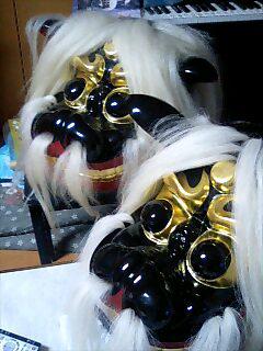 写真では同じような獅子頭が並んでいますが、作者にとってはカナリ違って見えるから不思議です。表情も毛も上の獅子は目が吊り上って険しく白い毛はヤク、下の獅子はおっとりとした表情で毛は白馬のたてがみです。姉妹には変わりありませんがね・・・。