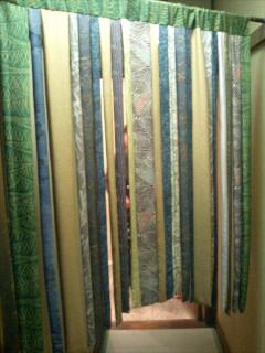 トイレ前の手作りの暖簾は古い絹の絞りの生地を袋にして作られていました。少し大きめで斜めに取り付けられているのがいいですね。