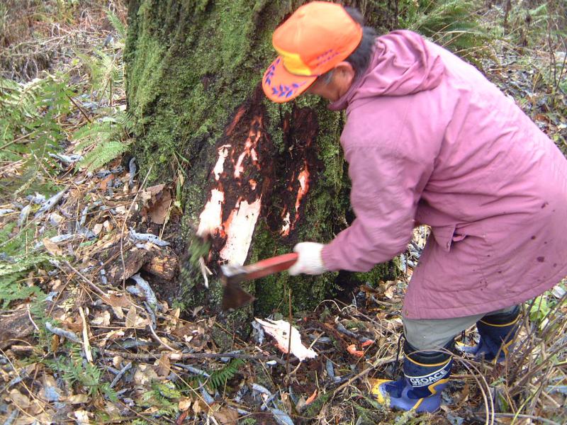 根元を斧で削り状態を見ます。