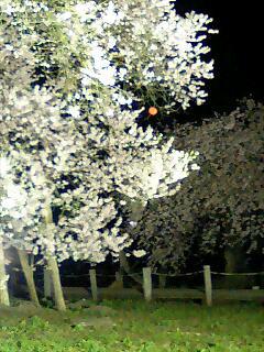 見頃を迎えた夜の久保桜の背景に大きな赤い月が上りました。伊佐沢神社の獅子舞の稽古の帰り寄ってみました。桜は灯りに照らされしっとり美しく輝いていました。
