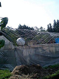 昨日未明から台風並みに吹き荒れた風が獅子宿のそばのビニールハウスをついに襲いました。真っ二つに引き裂かれモスラの羽化した後の卵の様です。嗚呼〜飛んでいったのはモスラの成虫でなくお金でした。なんとか雨が降る前に修復しなくてはなりません。