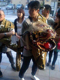 山形市ではっぴを着て歩く若者たちを発見!何やら獅子を持ってこちらに近づいてきます。宇津権九郎型の獅子です。後ろから囃子と一緒にお神輿の集団が…今日はお祭りなんですね!獅子に頭を噛んでもらい厄払いをしていただきました。