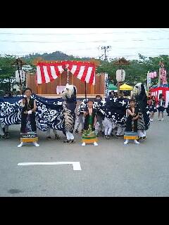 長井小学校72名の子供達が「ながい黒獅子まつり」で舞いました。小粒ながらピリリとした獅子舞を披露いたしました。怪我やアクシデントもなく稽古の成果を十二分発揮し息のあった獅子舞でした。問題の衣装着せもベテランの先生方のご指導もあって完了。いつも雨を呼ぶ獅子のまつりと言われ、心配だった雨もやはり落ちてきてましたが、寸前で免れました。今日は昨日のプレッシャーから解放され気が抜けた状態です。