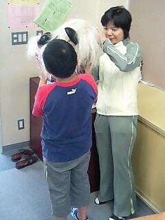 獅子舞クラブの時間での出来事でした。この子は獅子が怖くて近づく事もできないのに獅子舞に興味があり獅子舞クラブに所属していましたが、今日劇的な変化です!初めて獅子頭を持って触りだしました。でも幕をつけた動く獅子はまだ苦手で近寄ることができません。太鼓に興味を持ってくれればもっと自信がつくのですが…ゆっくりと親しむことが早道なのかな〜。
