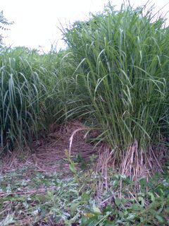 丈が長い茅です。まだまだ伸びるようで、いい茅材になりそうです。先日も報告しましたが前の年に枯れて倒れた茅が層を作り雑草の繁殖をを防いでいるのがわかります。草刈り機の刃こぼれで下刈り作業を中止いたしました。
