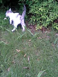 にゃんこ二匹、1日中家に缶詰めで可哀想なので庭の芝生に放しました。水を得た魚ならぬにゃんこです。楽しそう〜