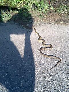 雨上がりの日光浴を楽しんでいるかのようです。そ〜っと近づいても知らぬふりです。尻尾をつついても反応無し!寝ているのでしょうか〜。にゃんこのお土産にしてあげようかと頭によぎった時ようやく危険を察してか逃げ出しました。考えてみると草刈りをしていたんできっと賢いニョロニョロは道端に非難していたのでしょうね〜。