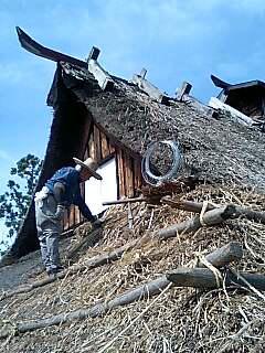 七月半ば炎天下の茅葺き屋根の午前中。日当たりが良すぎ過酷な環境での作業ですが、午後からは日陰になり多少は楽になりますが暑さで大変な仕事です。風があるからそうでもない♪と真っ黒に日に焼けた職人さんです。いやぁぁ〜ひ弱な私には出来そうもない仕事です。ややや〜午後から雷でにわか雨ですか?とラジオが予報してます。
