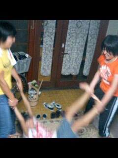 ばあちゃんちでお盆の墓参りの後の食事会。長女が山形からバイトを繰り上げて帰ってきました。遅れて高校生の次女もスーパーでのバイトから帰ってきて勢ぞろいしました。ごっつぉーをたらふくに頂き、最後の仕上げは生意気盛りな三女を生け贄のモンキーブランコです。
