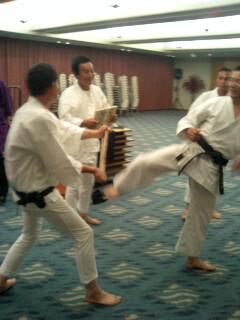 余興で長井鉄人会の有志が板割りの妙技を披露。