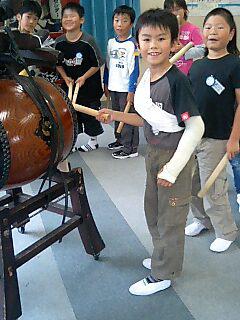 夏休みや運動会やらで久しぶりの児童センター獅子舞クラブ…しばらく見ない内に成長著しく、骨折しながらも太鼓に挑戦してる子もいました!子供の頃の骨折は魔法のように治りが早いようです。ギブスなんてなんのその!エンジン全開で太鼓に向かっていきます。