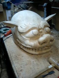 この獅子の耳の角度が問題…普通はこんな角度ですが、こちらの獅子の耳のホゾ穴はユルユルで下がり微妙な角度なんです。これから微調整が必要ですね…しかもかなり薄く彫り込まれ軽量化を意識しているようです。