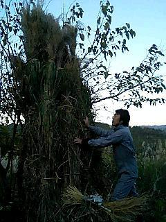 茅の束を木に立てかけ来春までさらして乾燥させます。