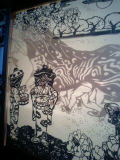 1メートル角の画面8枚と回転する3メートルの画面2枚は、切り絵をパソコンで編集し、