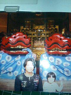 写真には御輿を守るように巨大な一対の雄雌の獅子頭が鎮座しています!